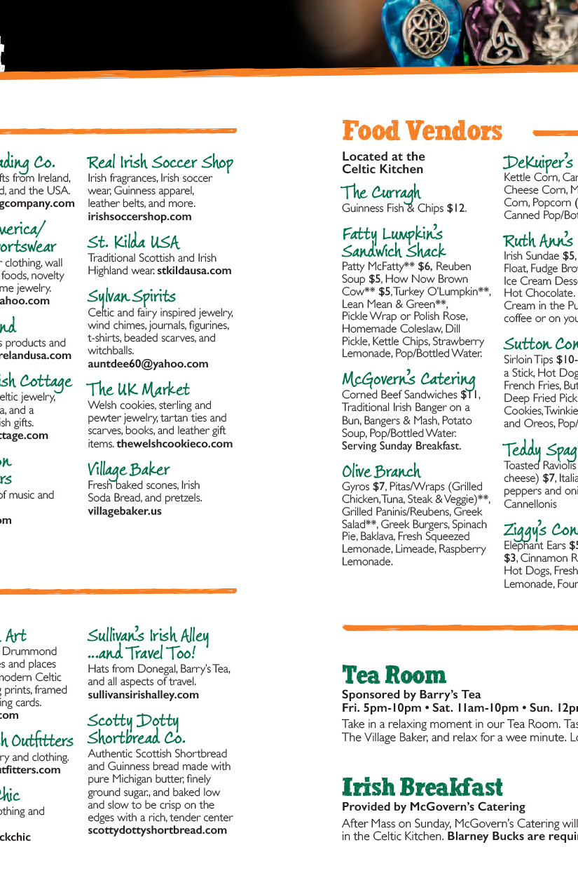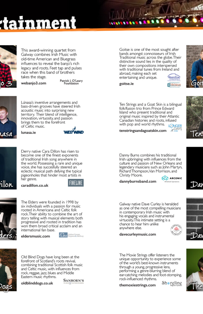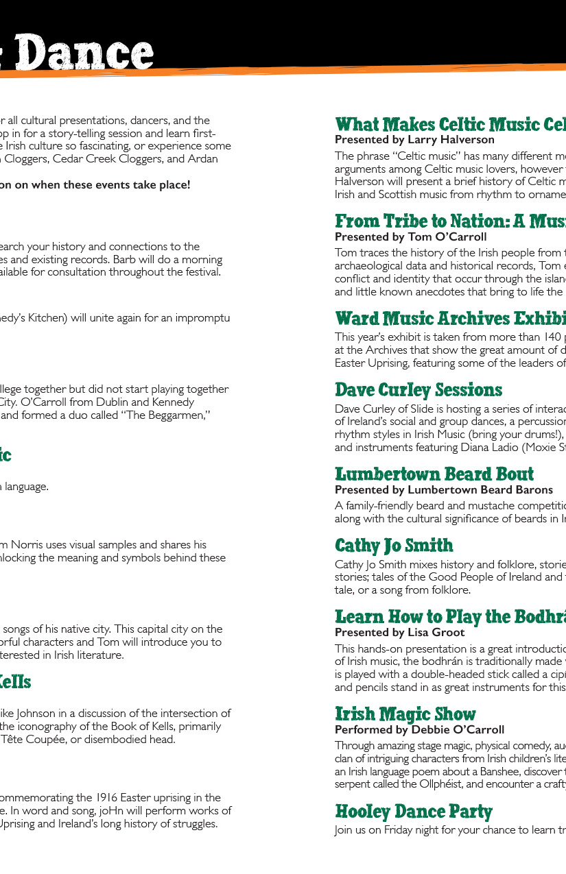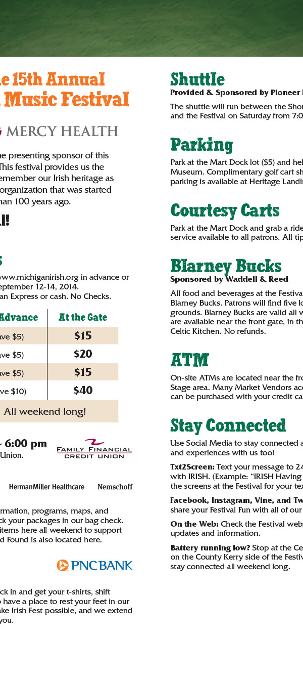 The Festival publishes a 20-page event program each year that contains everything you need to know about what's going on at the festival, including parking and admission details, daily performance schedules, details about the various activities and cultural presentations, photos and bios of performing bands and musicians, food and market vendor info, and a section crediting festival sponsors with their logos.